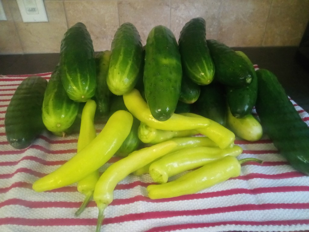 Then I was going to start on some corn salsa but thought I would first take a trip out to the garden to see if there were enough hot peppers. And found a dozen or so cucumbers that needed processing.