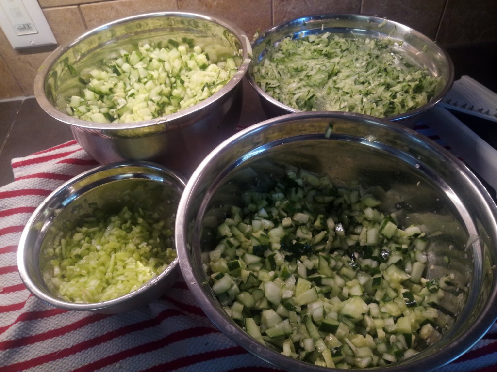 With the corn salsa on hold, we started to process the cucumbers and peppers into relish. Suzanne with a knife and we with a mandela. The variety of textures will complement each other nicely.